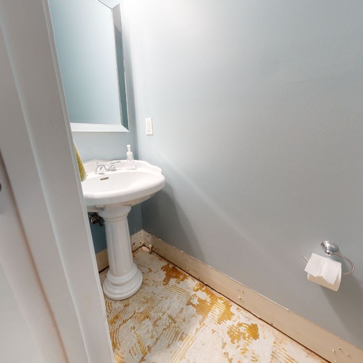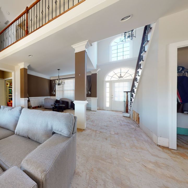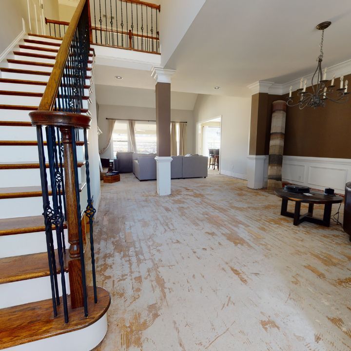 The rebuild’s most challenging aspect was the flooring. The sewage water had seeped into the home's floor, so we replaced floors throughout the first and second floors. This required pulling up and removing the damaged hardwood flooring, carpets, and carpet pads, removing baseboards, repairing and replacing water-logged subflooring, returning baseboards to their proper position, and installing new hardwood flooring and tiling.